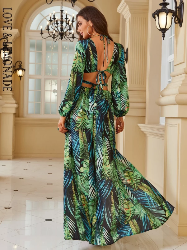 LOVE & LIMONADE Sexy vert col en V profond à manches longues découpe fente Patchwork motif fête Maxi robe LM84372